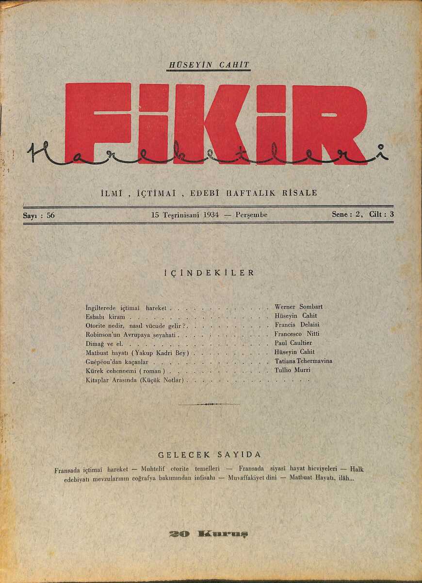 Fikir Hareketleri İlmi, İçtimai, Edebi Haftalık Risale 15 Kasım (Teşrinisani) 1934 Sayı: 56 - Hüseyin Cahit Yalçın - Werner Sombart NDR98797