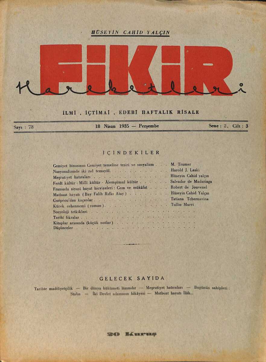 Fikir Hareketleri İlmi, İçtimai, Edebi Haftalık Risale 18 Nisan 1935 Sayı: 78 - Hüseyin Cahit Yalçın - Tullio Murri NDR98747