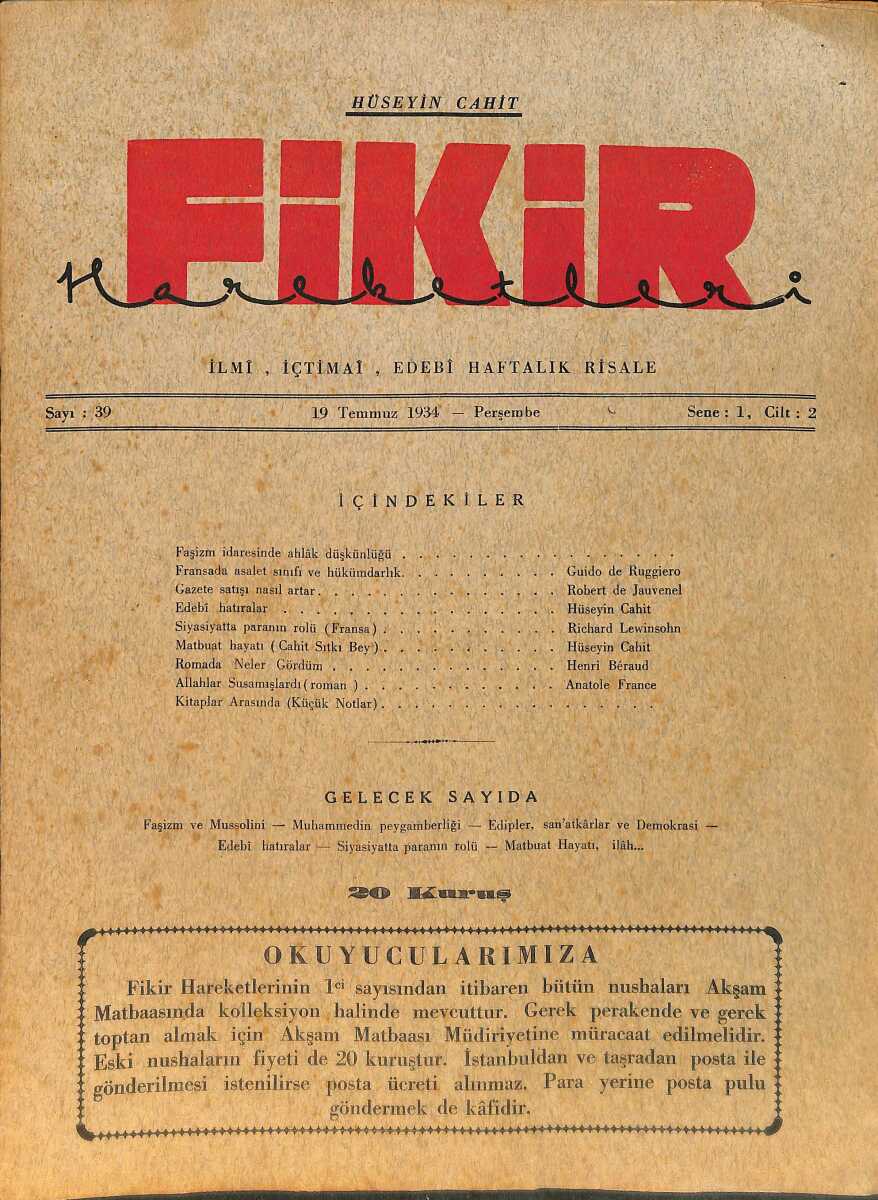 Fikir Hareketleri İlmi, İçtimai, Edebi Haftalık Risale 19 Temmuz 1934 Sayı: 39 - Hüseyin Cahit Yalçın - Anatole France NDR98767