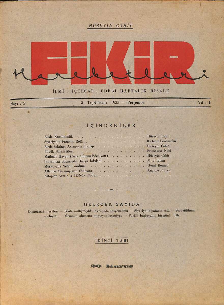 Fikir Hareketleri İlmi, İçtimai, Edebi Haftalık Risale 2 Kasım (Teşrinisani) 1933 Sayı: 2 - Hüseyin Cahit Yalçın - Anatole France NDR98745