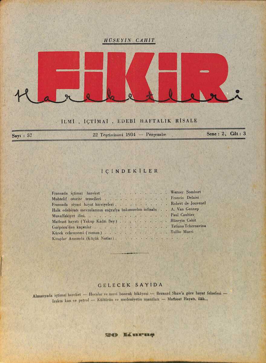 Fikir Hareketleri İlmi, İçtimai, Edebi Haftalık Risale 22 Kasım (Teşrinisani) 1934 Sayı: 57 - Hüseyin Cahit Yalçın - Werner Sombart NDR98796