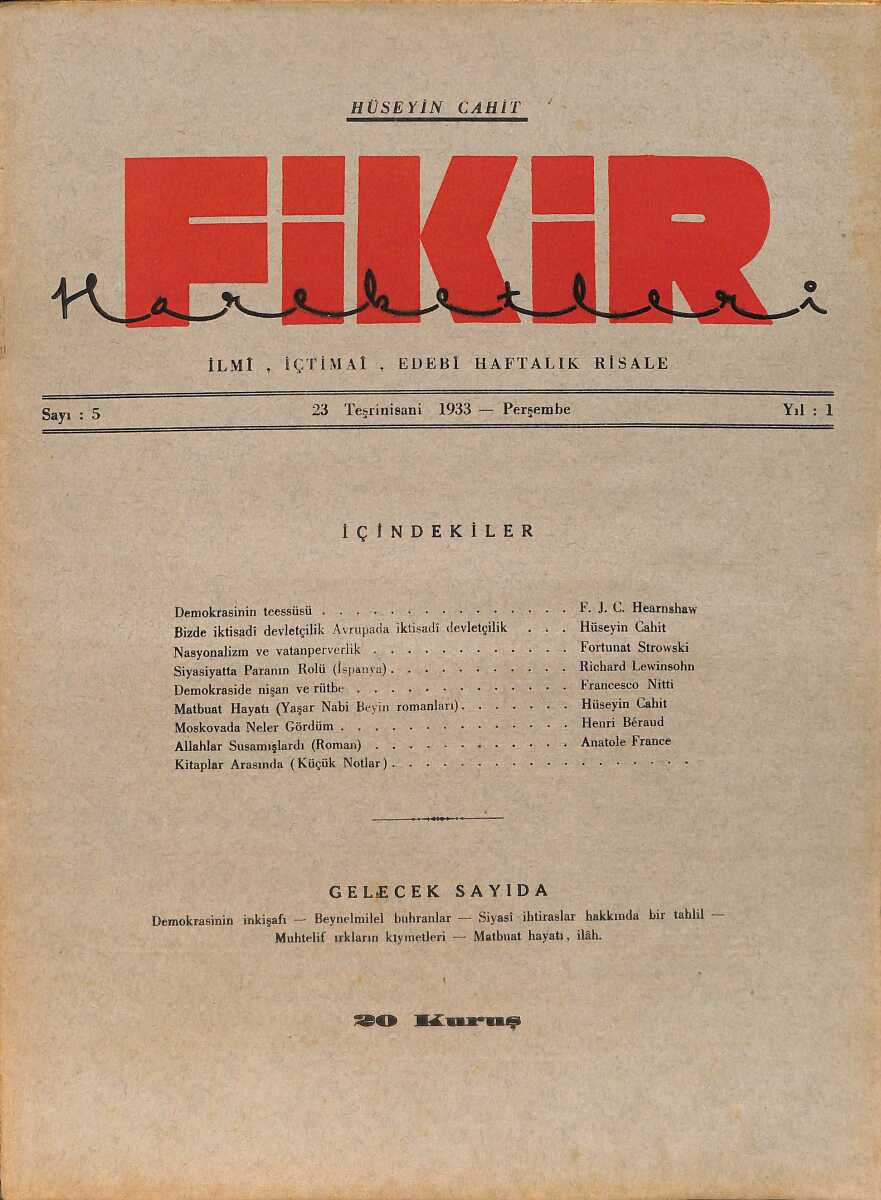 Fikir Hareketleri İlmi, İçtimai, Edebi Haftalık Risale 23 Kasım (Teşrinisani) 1933 Sayı: 5 - Hüseyin Cahit Yalçın - Henri Beraud NDR98742