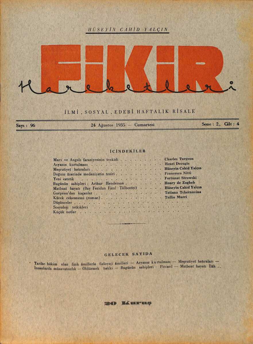 Fikir Hareketleri İlmi, İçtimai, Edebi Haftalık Risale 24 Ağustos 1935 Sayı: 96 - Hüseyin Cahit Yalçın - Charles Turgeon NDR98783