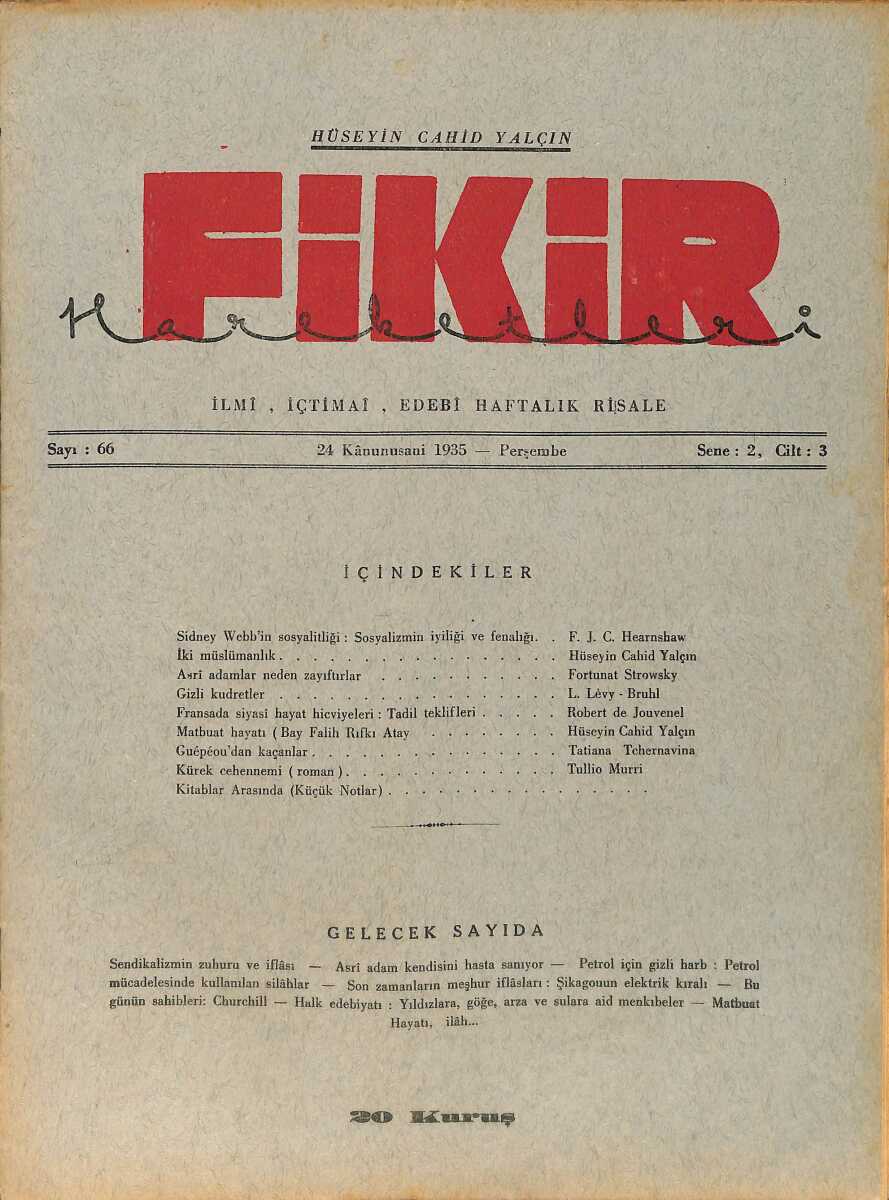 Fikir Hareketleri İlmi, İçtimai, Edebi Haftalık Risale 24 Ocak (Kanunisani) 1935 Sayı: 66 - Hüseyin Cahit Yalçın - Fortunat Strowsky NDR98759