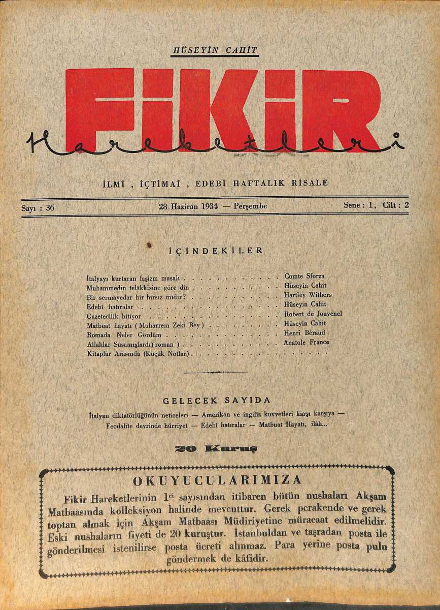 Fikir Hareketleri İlmi, İçtimai, Edebi Haftalık Risale 28 Haziran 1934 Sayı: 36 - Hüseyin Cahit Yalçın - Anatole France NDR98771