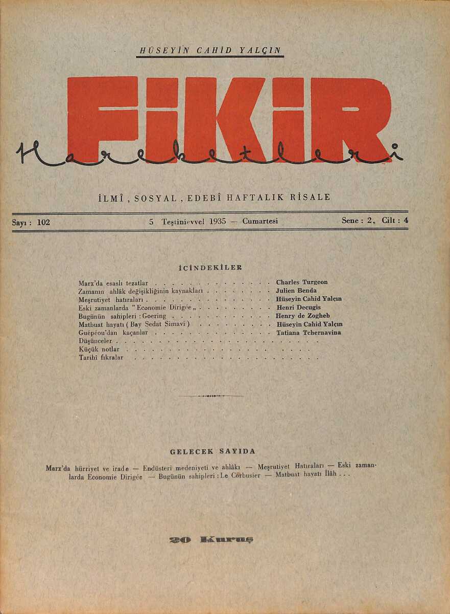 Fikir Hareketleri İlmi, İçtimai, Edebi Haftalık Risale 5 Ekim (Teşrinievvel) 1935 Sayı: 102 - Hüseyin Cahit Yalçın - Charles Turgeon NDR98789