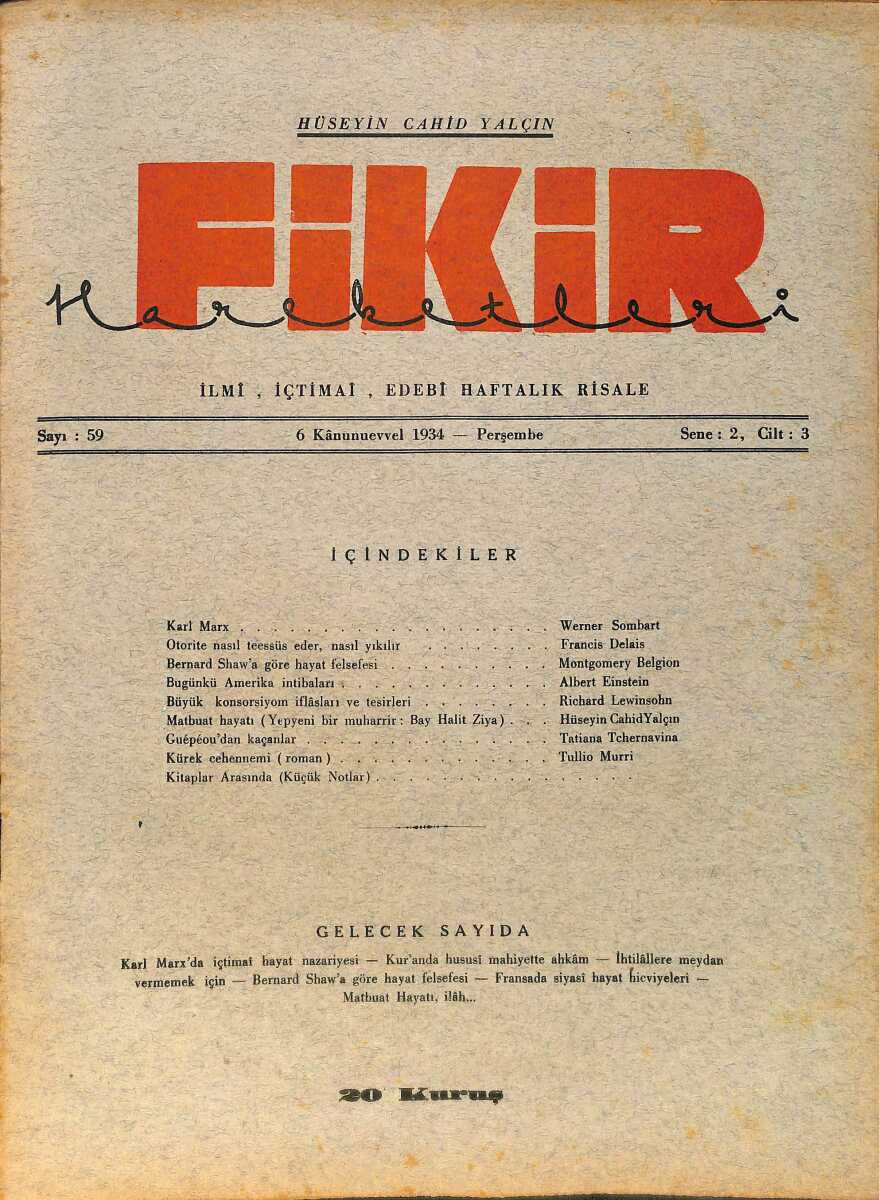 Fikir Hareketleri İlmi, İçtimai, Edebi Haftalık Risale 6 Aralık (Kanunuevvel) 1934 Sayı: 59 - Hüseyin Cahit Yalçın - Werner Sombart NDR98794