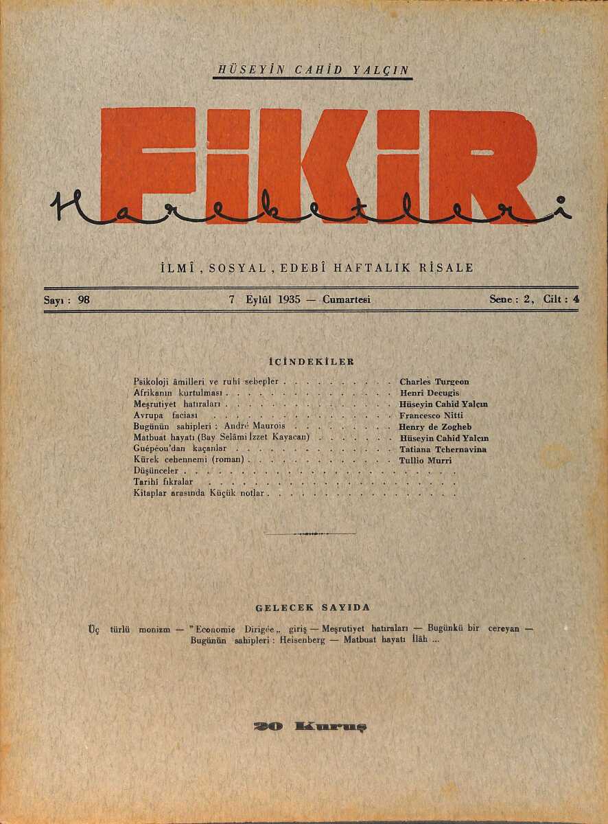 Fikir Hareketleri İlmi, İçtimai, Edebi Haftalık Risale 7 Eylül 1935 Sayı: 98 - Hüseyin Cahit Yalçın - Charles Turgeon NDR98785