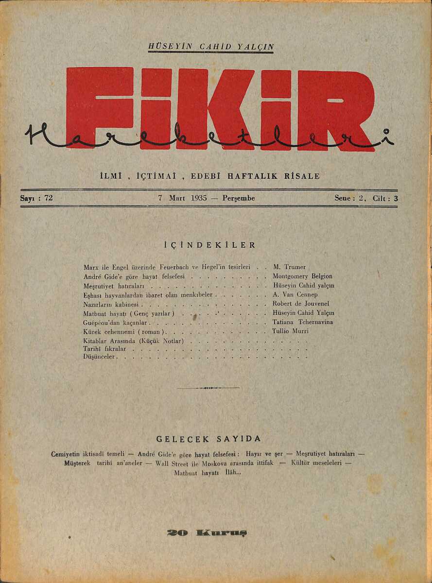 Fikir Hareketleri İlmi, İçtimai, Edebi Haftalık Risale 7 Mart 1935 Sayı: 72 - Hüseyin Cahit Yalçın - Tullio Murri NDR98753