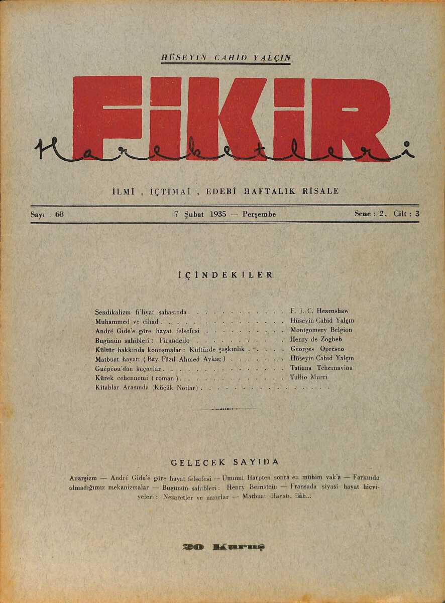 Fikir Hareketleri İlmi, İçtimai, Edebi Haftalık Risale 7 Şubat 1935 Sayı: 68 - Hüseyin Cahit Yalçın - Georges Opreseo NDR98757