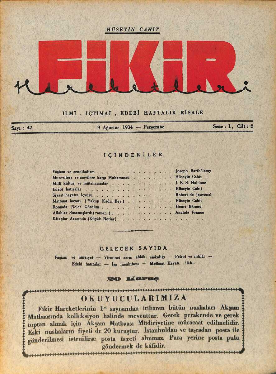 Fikir Hareketleri İlmi, İçtimai, Edebi Haftalık Risale 9 Ağustos 1934 Sayı: 42 - Hüseyin Cahit Yalçın - Anatole France NDR98764
