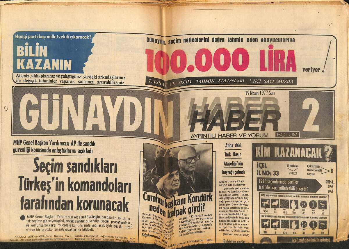 Günaydın Haber Gazetesi 19 Nisan 1977 - Cumhurbaşkanı Korutürk Neden Kalpak Giydi - Seçim Sandıkları Türkeş'in Komandoları Tarafından Korunacak GZ152127