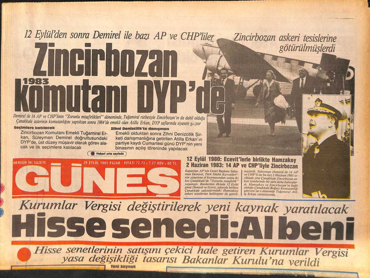 Güneş Gazetesi 29 Eylül 1985 - Zincir Bozan Komutanlar DYP'de - ANAP'lı Resuloğlu " Millet Yastayken Baloda Eğlenemedim " GZ158255