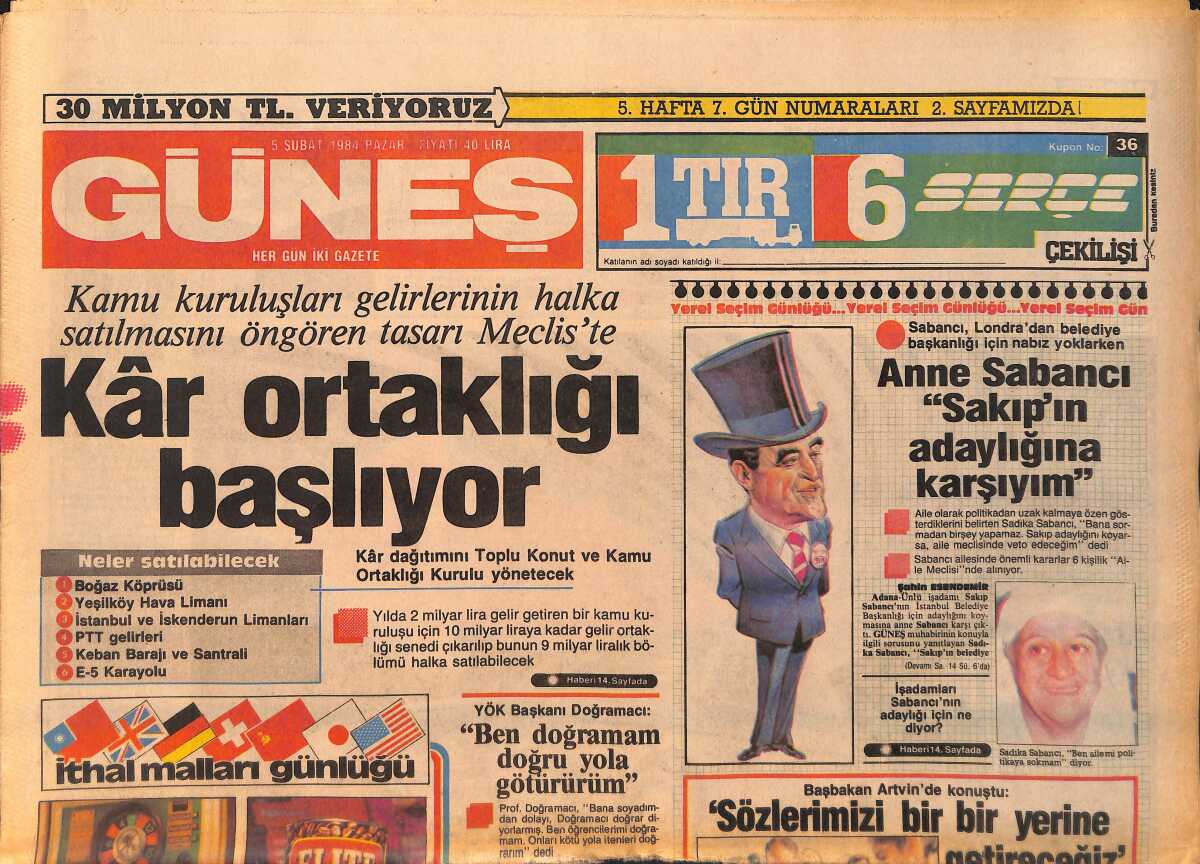 Güneş Gazetesi 5 Şubat 1984 - Sabancı Londra'dan Belediye Başkanlığı İçin Nabız Yokluyor - Çorum Olayları Davası Sonuçlandı GZ158171