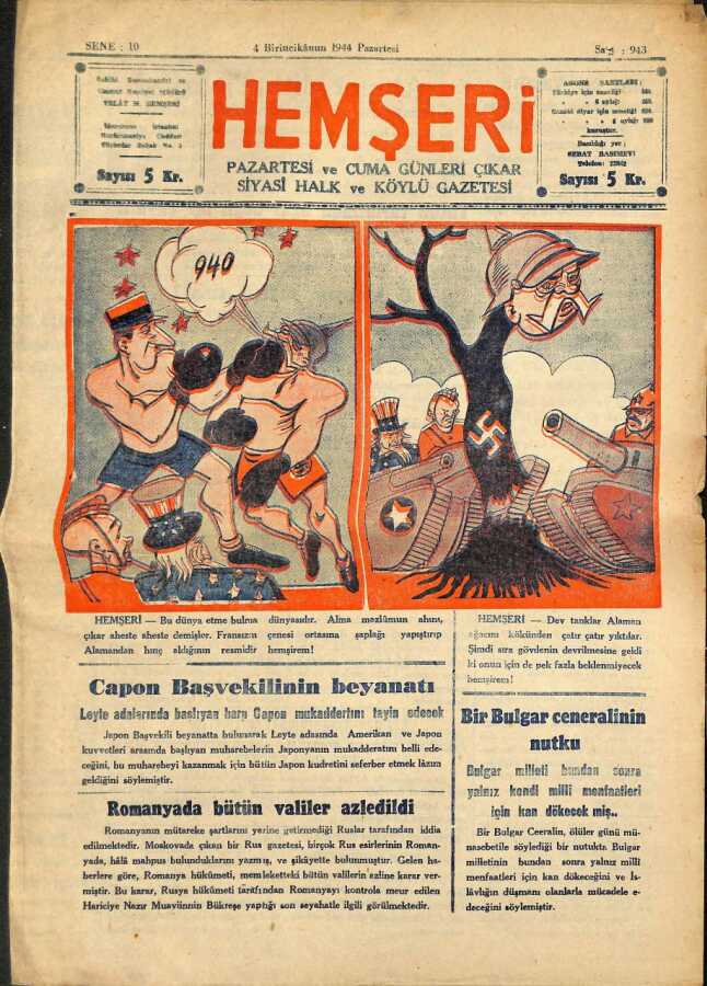 HEMŞERİ SİYASİ HALK VE KÖYLÜ GAZETESİ - NO943 4 Birincikanun 1944 (İlk Baskı Orijinal - Ciltten Çıkma Değildir) NDR66841
