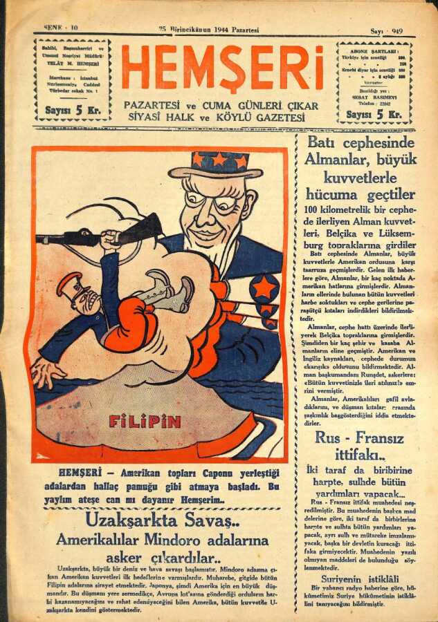 HEMŞERİ SİYASİ HALK VE KÖYLÜ GAZETESİ - NO949 25 Birincikanun 1944 (İlk Baskı Orijinal - Ciltten Çıkma Değildir) NDR66843