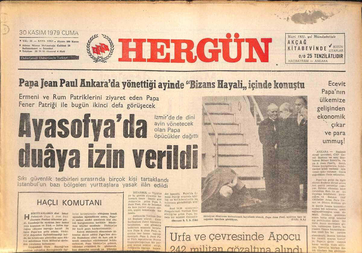 Her Gün Gazetesi 30 Kasım 1979 - Ayasofya'da Duaya İzin Verildi - Papa Jean Paul Ankara'da Yönettiği Ayinde Bizans Hayali İçinde Konuştu GZ142271