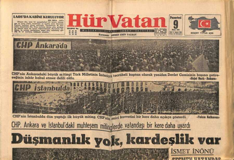 Hür Vatan Gazetesi 9 Ekim 1961 - İsmail Rüştü Aksal,Düşmanlığa Dostluk Yalana Gerçekle Karşı Koyacağız GZ97115