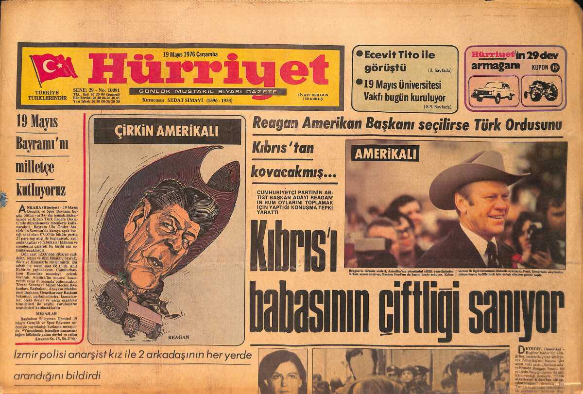 Hürriyet Gazetesi 19 Mayıs 1976 - Reagan Kıbrıs'ı Babasının Çiftliği Sanıyor-Yahya Demirel 50 Bin Lira Kefaletle Tahliye Edildi-Sevim Tuna Gazino Afiş GZ158258
