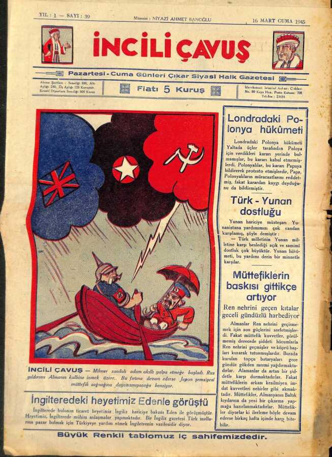 İNCİLİ ÇAVUŞ DERGİSİ 16 Mart 1945 SAYI39 (İlk Baskı Orijinal - Ciltten Çıkma Değildir) NDR66855