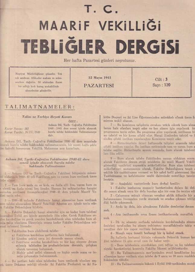 Maarif Vekilliği Tebliğler Dergisi Cilt3 Sayı120 12 Mayıs 1941 NDR55979