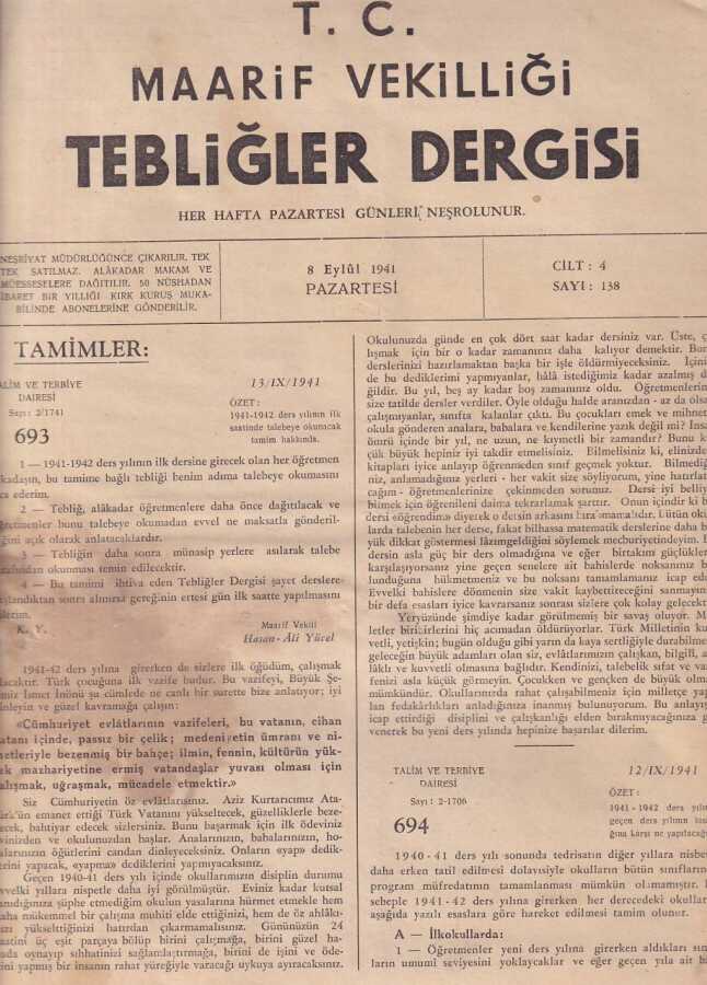Maarif Vekilliği Tebliğler Dergisi Cilt4 Sayı138 8 Eylül 1941 NDR55982