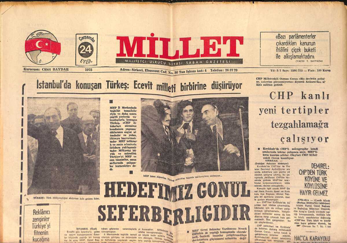 Millet Gazetesi 24 Eylül 1975 - İstanbul'da Konuşan Türkeş : Ecevit Milleti Birbirine Düşürüyor - Başkan Ford 3. Defa Suikastan Kurtuldu GZ158701