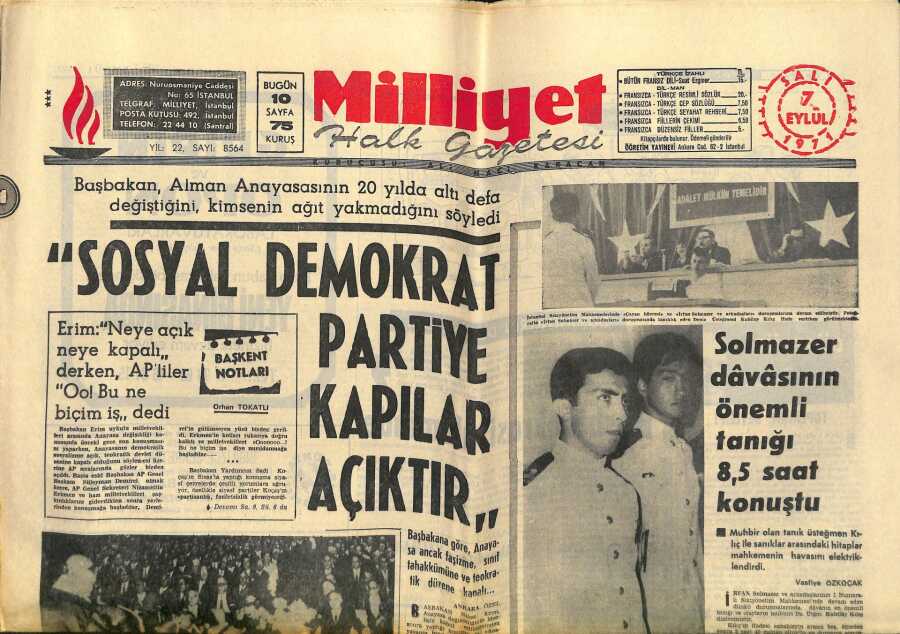 Milliyet Halk Gazetesi 7 Eylül 1971-Berlinde Her 20 Kişiden Biri Türk - Madanoğlu Tutuklandı-Gezmiş Davasında İrfan Uçar İçin Tahliye Kararı Verildi GZ118815