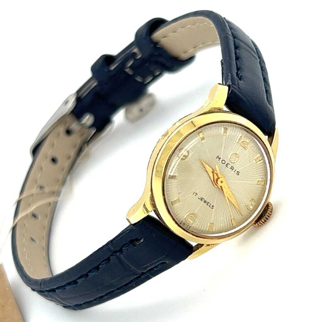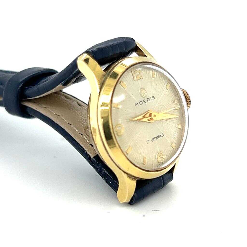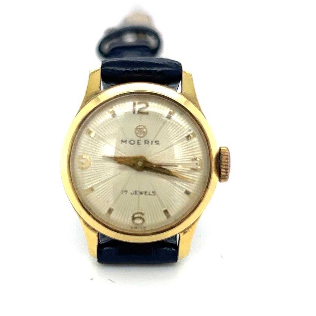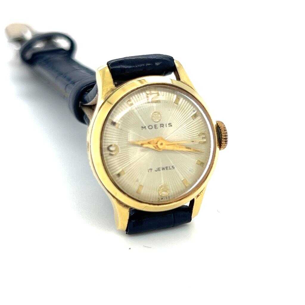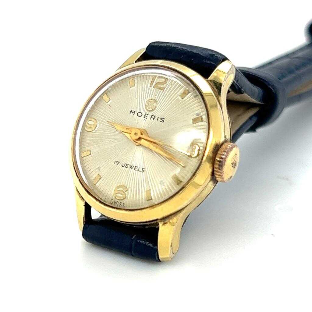 Vintage Moeris marka kurmalı bayan kol saati. Zarif ve klasik tasarımıyla döneminin saatçilik estetiğini yansıtan şık bir modeldir. Altın kaplama kasası sayesinde hem koleksiyonluk hem de günlük kullanım için dikkat çekici bir parçadır.