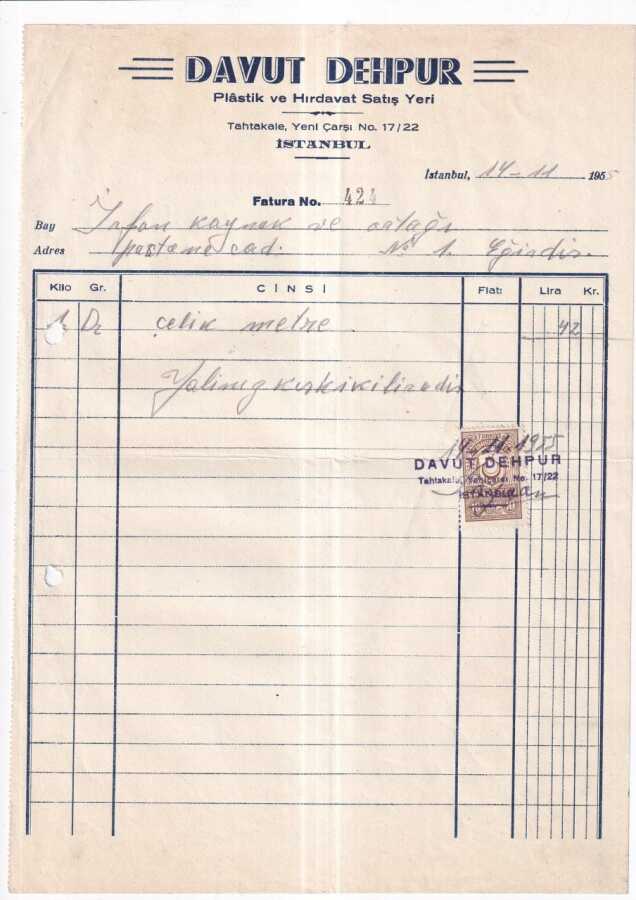 Musevi İş Adamı - DAVUT DEHPUR PLASTİK VE HIRDAVAT SATIŞ YERİ İSTANBUL.1955 YILI FATURA