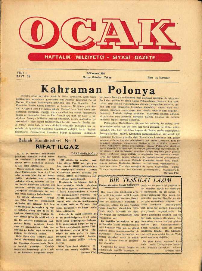 OCAK Haftalık Milliyetçi Siyasi Gazete 2 Kasım 1956 Sayı26 - Babıali Komünistleri No9 Rıfat Ilgaz, Rıza Nur, Teşkilatçı-İnkılapçı Gökalp NDR66733