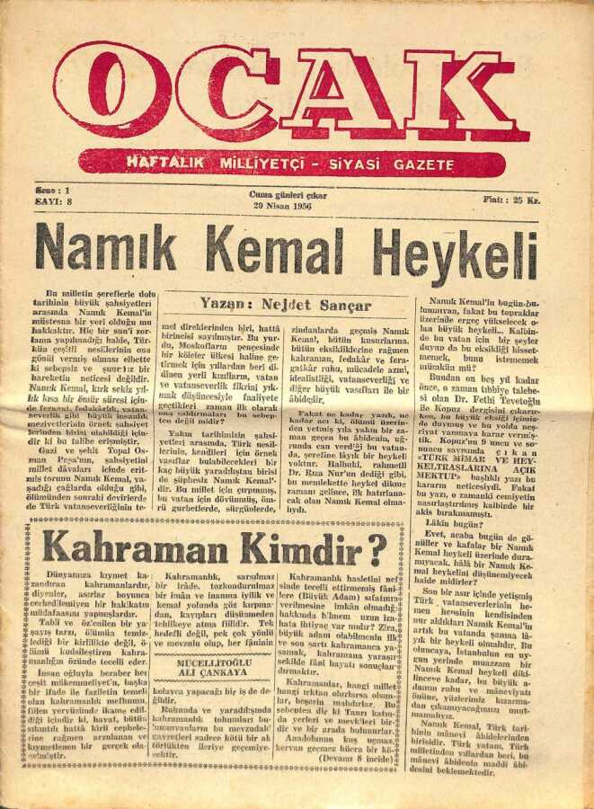 OCAK Haftalık Milliyetçi Siyasi Gazete 20 Nisan 1956 - Namık Kemal Heykeli, ONÜÇ Neşriyatı, R.O. Arık Ve Türklük NDR66737