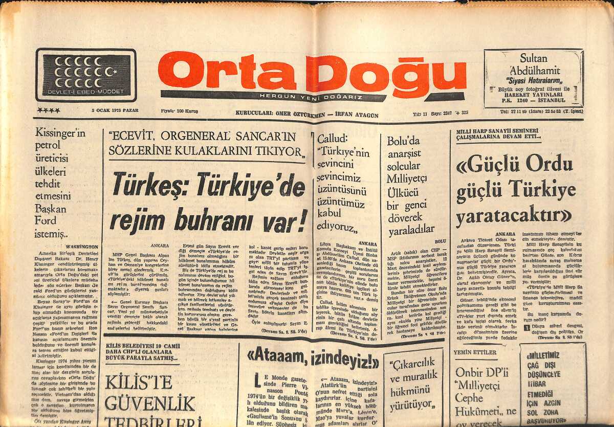 Orta Doğu Gazetesi 5 Ocak 1975 - Alpaslan Türkeş: Türkiye'de Rejim Buhranı Var! - Diyarbakır'da Solcu Aşık Mahzuni Halkı Kandırınca Olay Çıktı! GZ139310