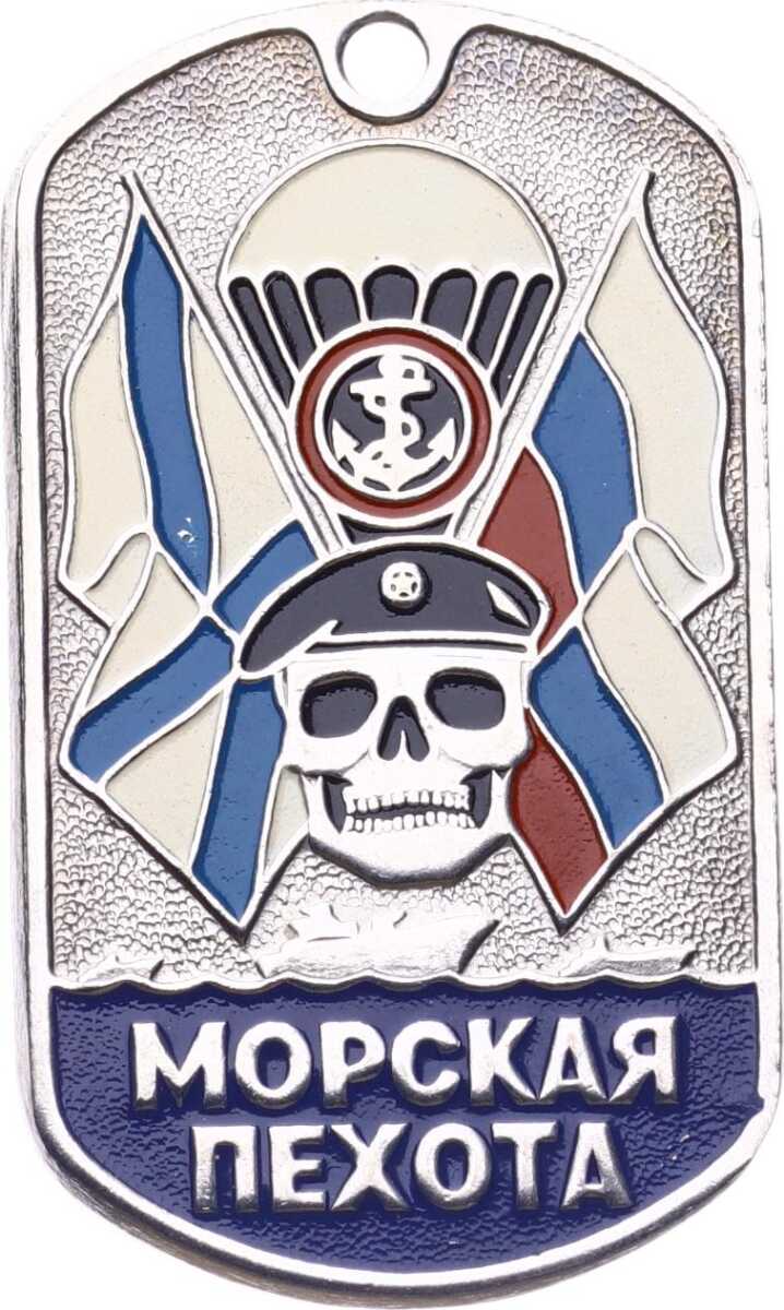 МОРСКАЯ ПЕХОТА (MORSKAYA PEKHOTA):Alt kısımdaki mavi zemin üzerinde Kiril alfabesiyle "Deniz Piyadesi" yazmaktadır.