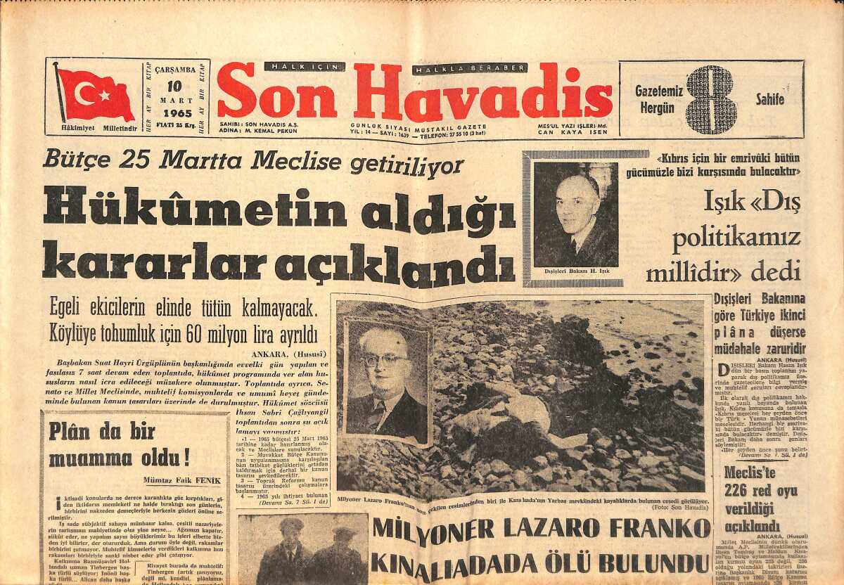 Son Havadis Gazetesi 10 Mart 1965 - Milyoner Lazaro Franko Kınalıada'da Ölü Bulundu GZ158867
