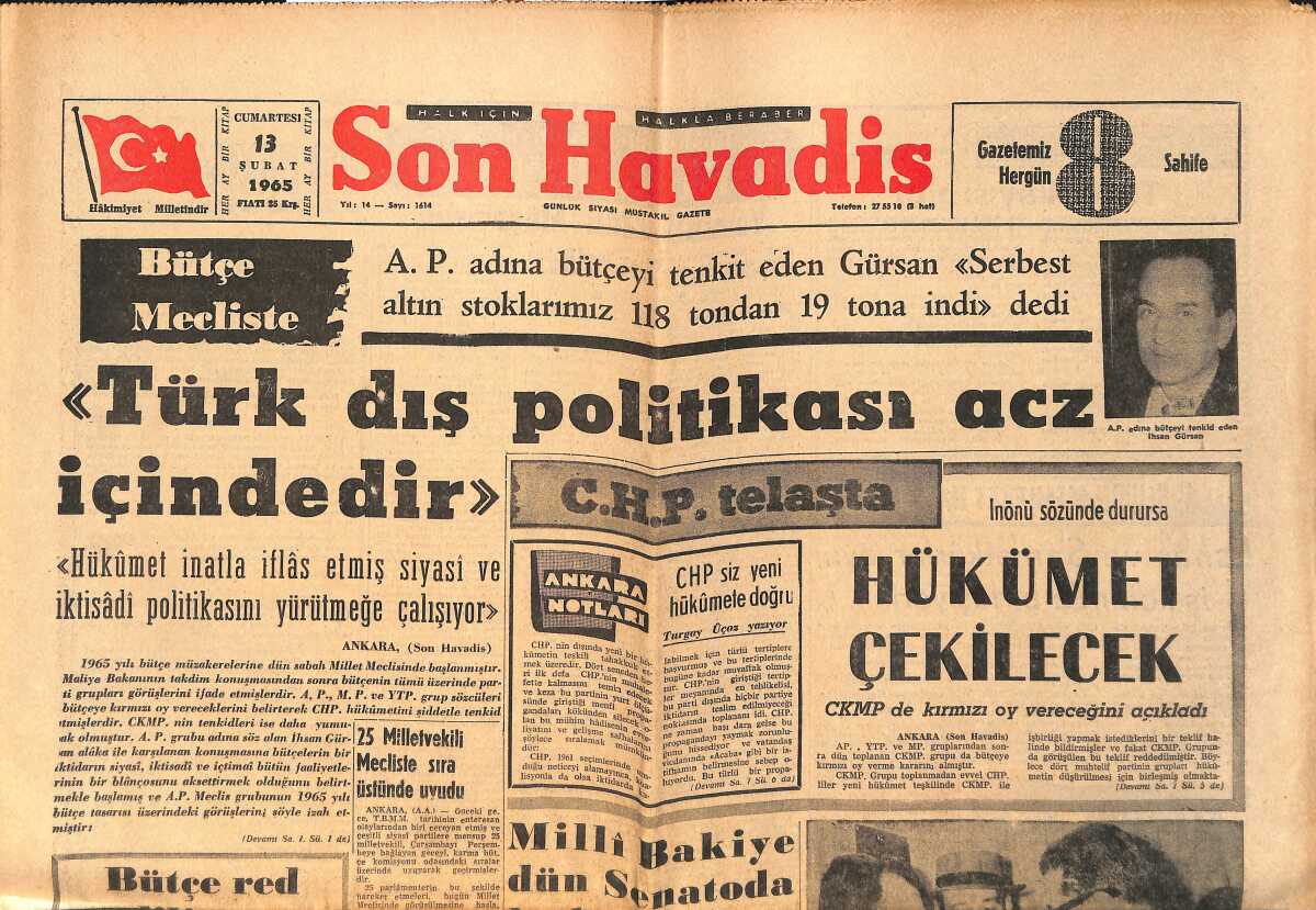 Son Havadis Gazetesi 13 Şubat 1965 - İnönü Sözünde Durursa Hükümet Çekilecek CKMP de Kırmızı Oy Vereceğini Açıkladı GZ158855