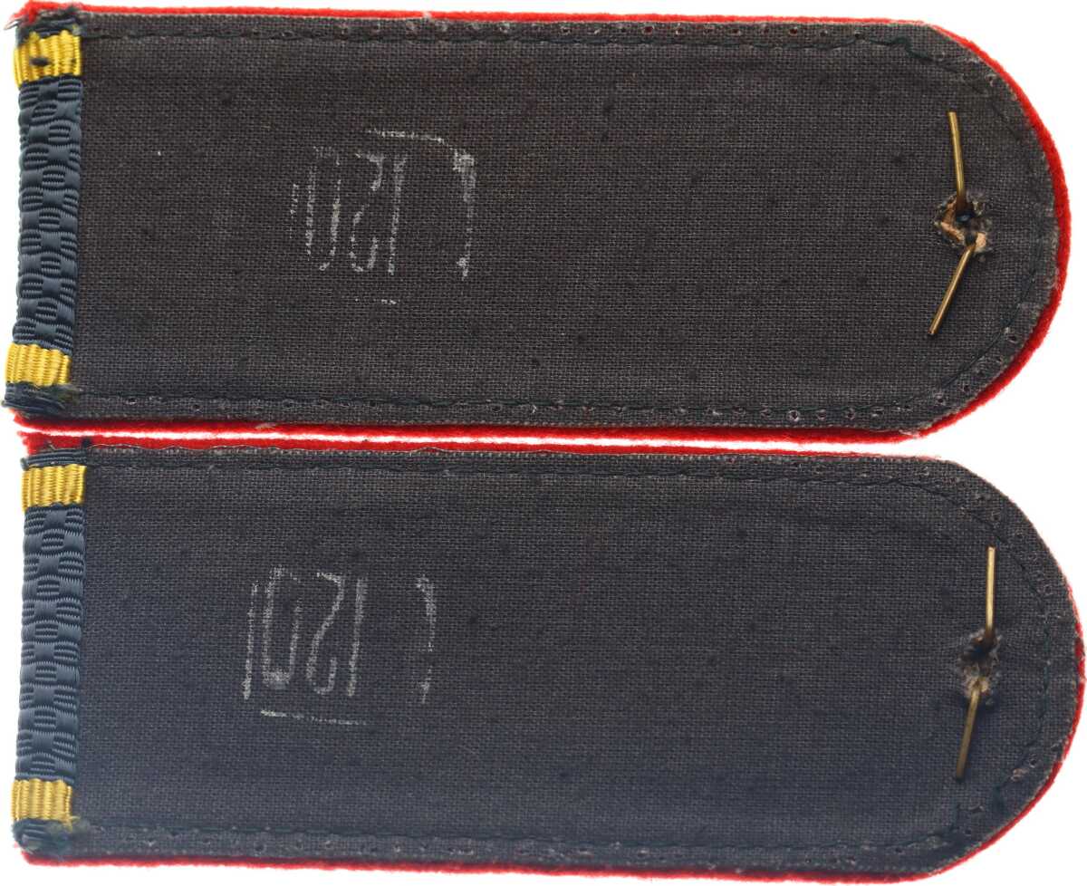 Kurum: Koyu gri/mavi (füme) zemin üzerindeki kırmızı kenar şeritleri (piping), bu parçaların Sovyet Milis teşkilatına (polis gücü) bağlı olduğunu gösterir.