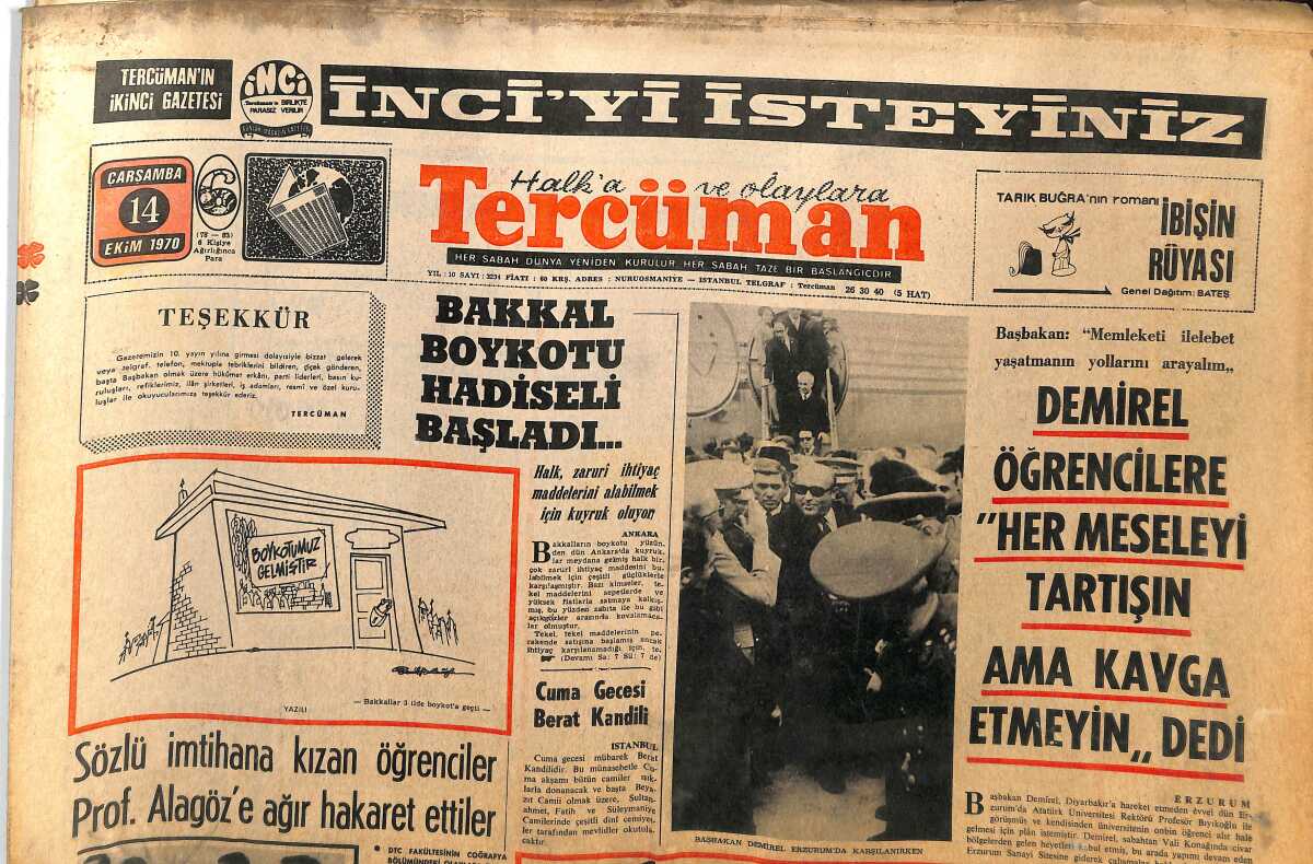 Tercüman Gazetesi 14 Ekim 1970 - Demirel Öğrencilere Her Meseleyi Tartışın Ama Kavga Etmeyin - İki Dansöz Otel Önünde Vuruldu GZ145272