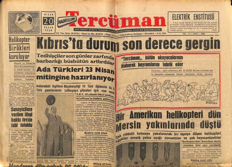 Tercüman Gazetesi 20 Nisan 1958 - Bir Amerikan Helikopteri Dün Mersin Yakınlarında Düştü GZ65852