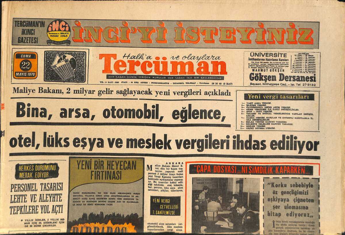 Tercüman Gazetesi 22 Mayıs 1970 - Bina,Arsa,Otomobil,Eğlence,Otel,Lüks Eşya Ve Meslek Vergileri İhdas Ediliyor GZ145433