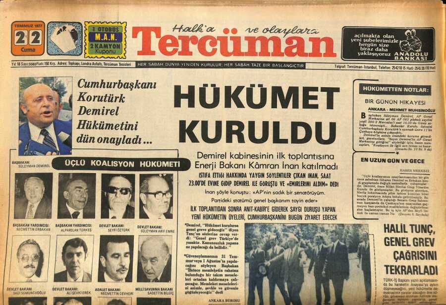 Tercüman Gazetesi 22 Temmuz 1977 - Cumhurbaşkanı Korutürk Demirel Hükümetini Dün Onayladı... GZ85684