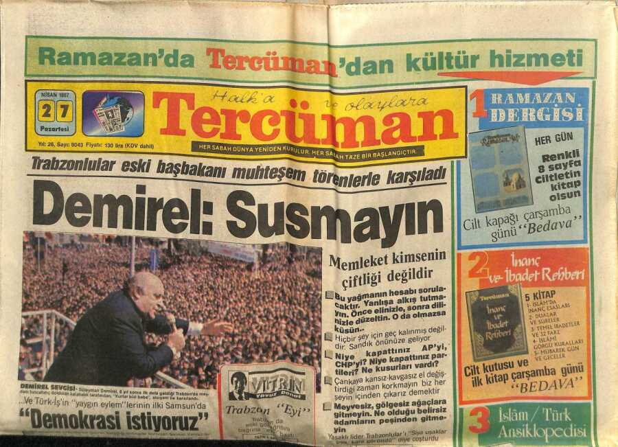 Tercüman Gazetesi 27 Nisan 1987 - Trabzonlular Eski Başbakanı Muhteşem Törenlerle Karşıladı GZ65248