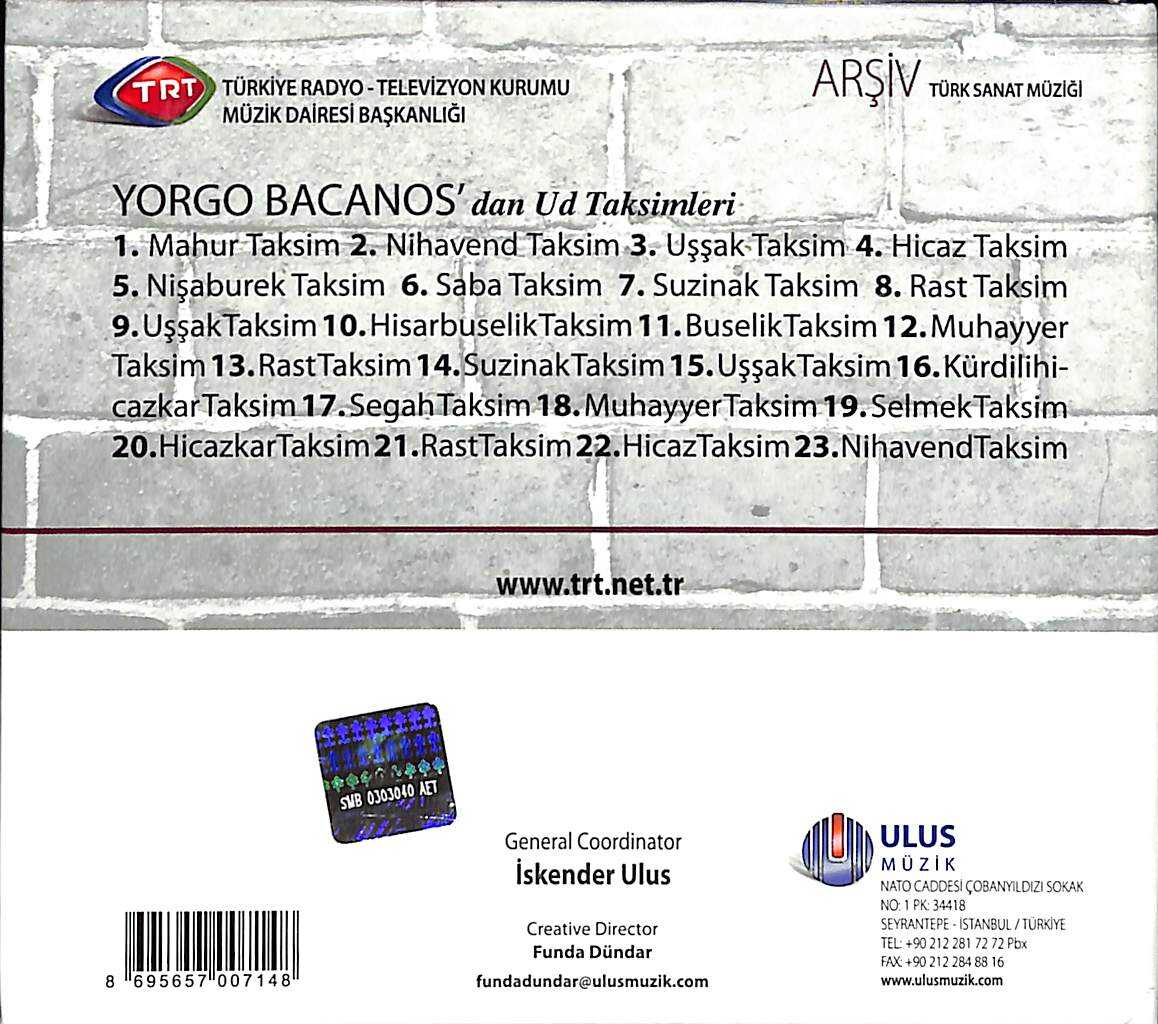TRT Arşiv Serisi - 152 - Yorgo Bacanos'dan Ud Taksimleri CD (İkinci El) CD4940
