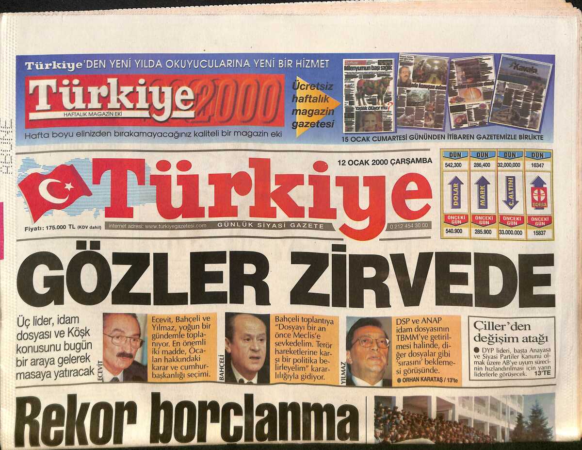 Türkiye Gazetesi 12 Ocak 2000 - Üç Lider Bugün Bir Araya Gelip, İdam Dosyasını Ve Köşk Konusunu Konuşacak - ABD'de İğneyle İnfaz GZ132428