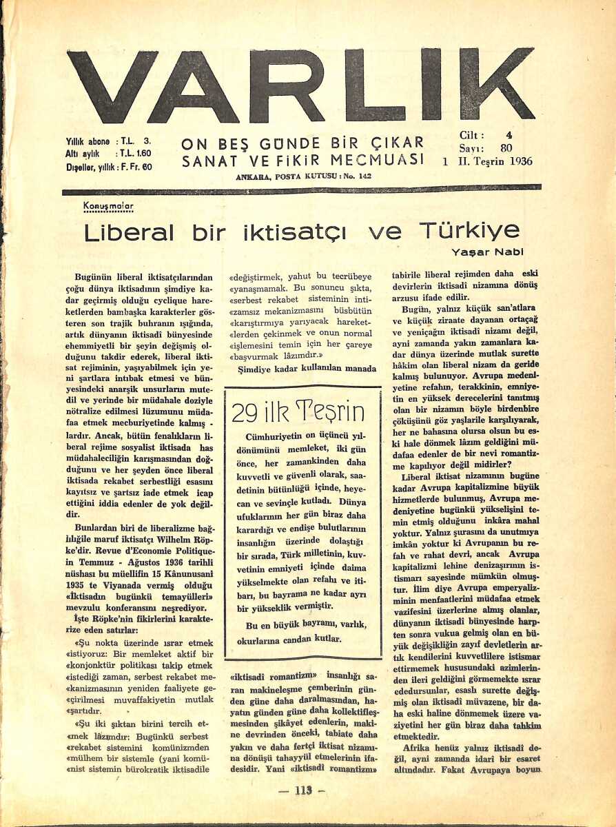 Varlık (On Beş Günde Bir Çıkar Sanat ve Fikir Mecmuası) 1 II. Teşrin 1936 Sayı:80 - Liberal Bir İktisatçı Ve Türkiye - Tarihin Bir Facia Sahnesi NDR90645