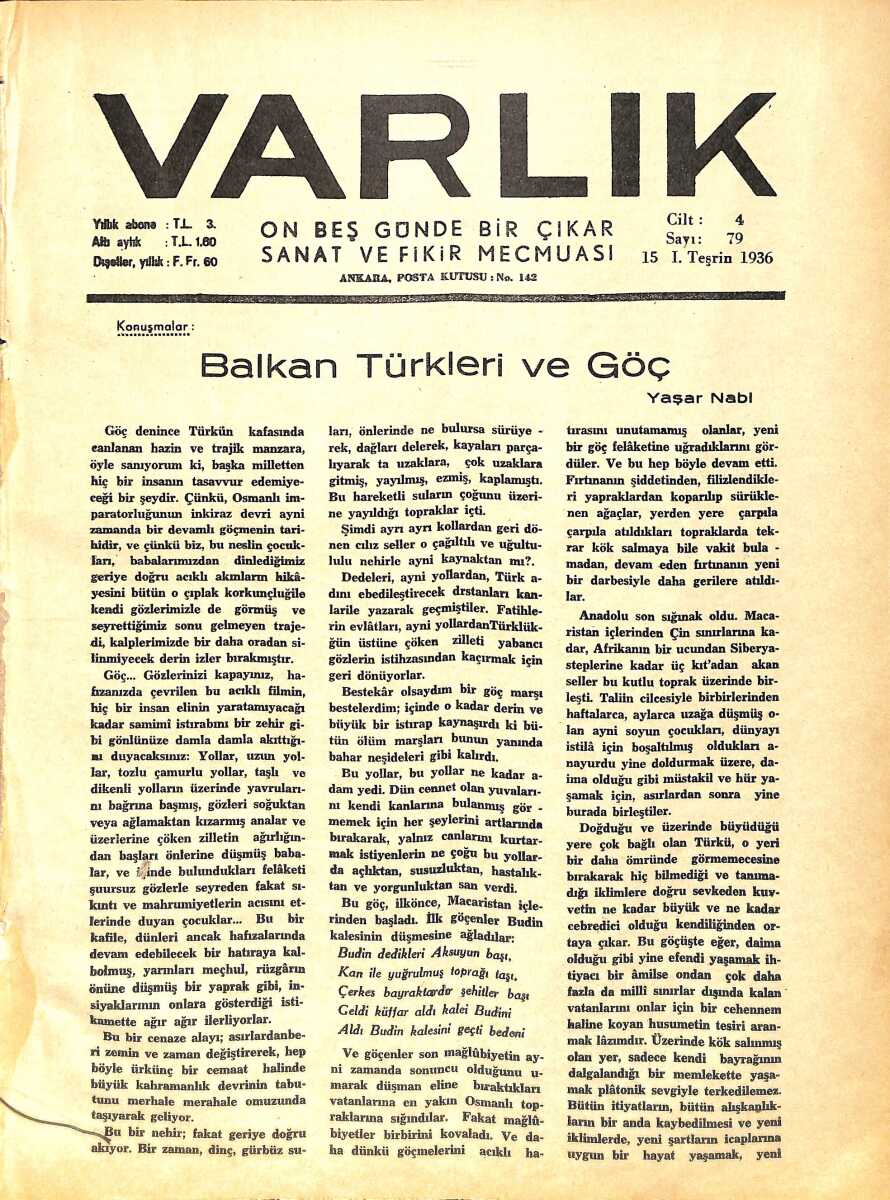 Varlık (On Beş Günde Bir Çıkar Sanat ve Fikir Mecmuası) 15 I. Teşrin 1936 Sayı:79 - Balkan Türkleri Ve Göç - Rabindranat Tagor 75 Yaşında NDR90644