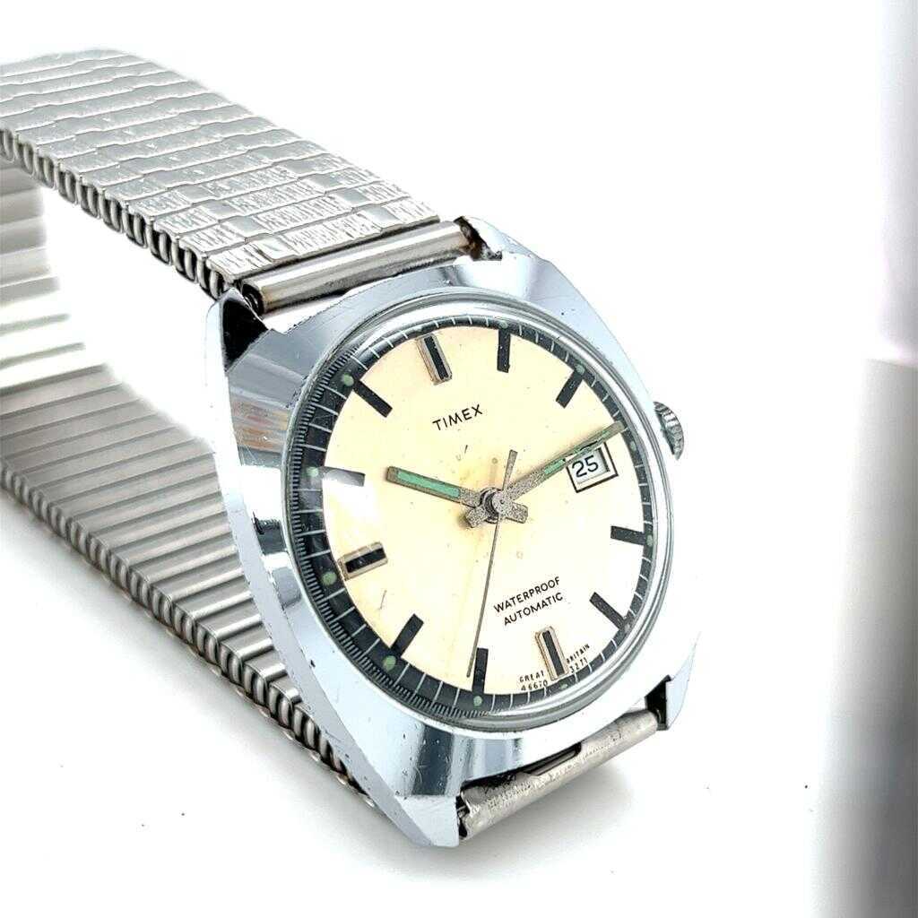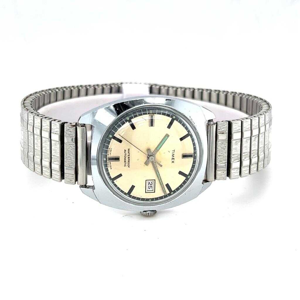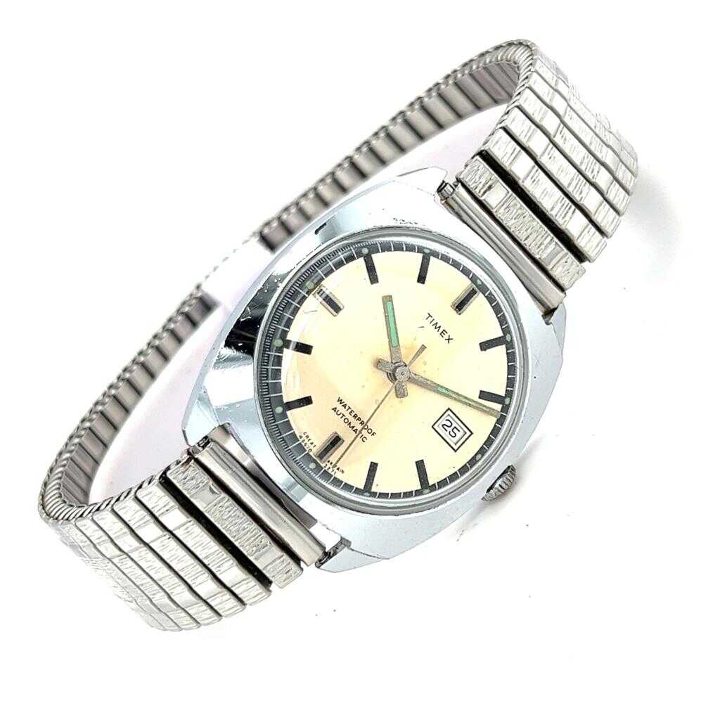 Vintage Timex marka otomatik kol saati. Klasik ve zamansız tasarımıyla döneminin saatçilik estetiğini yansıtan şık bir modeldir. Otomatik mekanizması sayesinde kol hareketiyle çalışır ve mekanik saat severler için oldukça keyifli bir kullanım sunar.