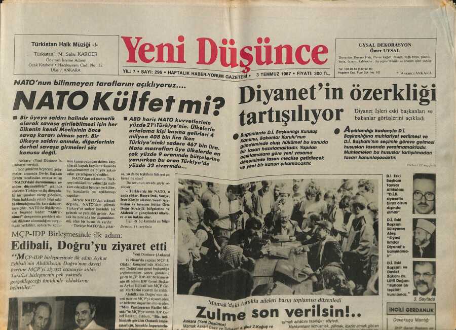 Yeni Düşünce Gazetesi 3 Temmuz 1987 - Diyanetin Özerkliği Tartışılıyor - Mamakdaki Tutuklu Aileleri Basın Toplantısı Düzenledi GZ122699
