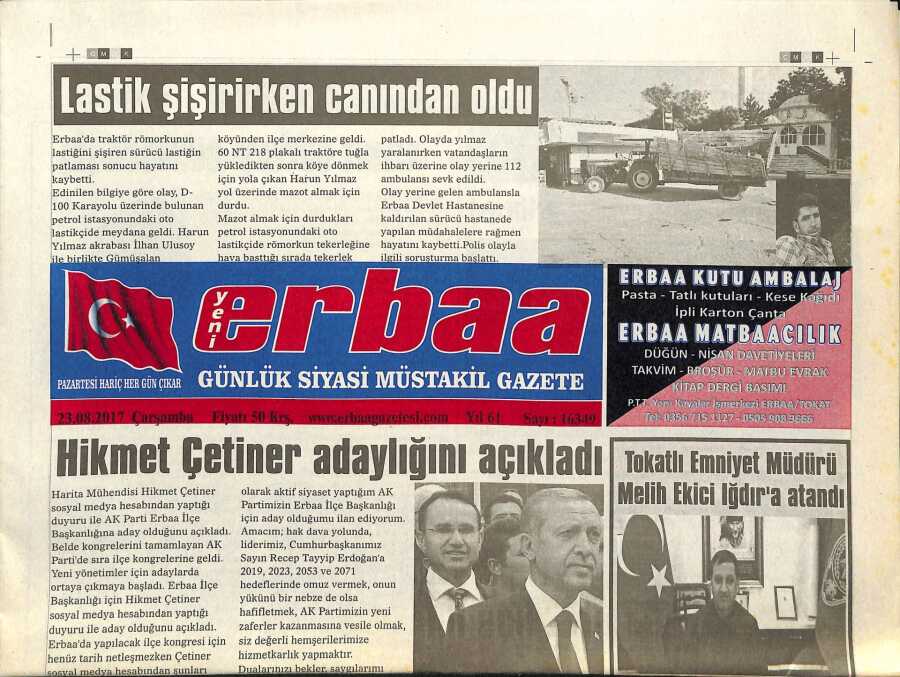 Yeni Erbaa Gazetesi 23 Ağustos 2017 - Hikmet Çetiner Adaylığını Açıkladı - Niksarda Anız Yangını GZ125219
