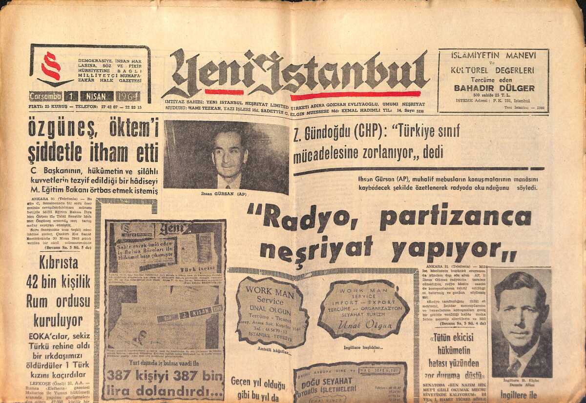 Yeni İstanbul Gazetesi 1 Nisan 1964 - Hasan Tuncay Beraet Etti - Özgüneş , Öktem'i Şiddetle İtham Etti GZ158789